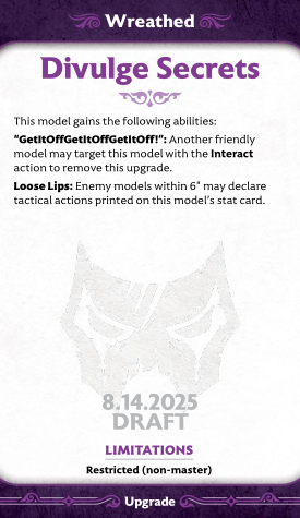 - Divulge Secrets lets enemies (that is, your models) declare the cursed target's tactical actions while they are within 6" of it. Sometimes, depending on the target, this is very nasty.