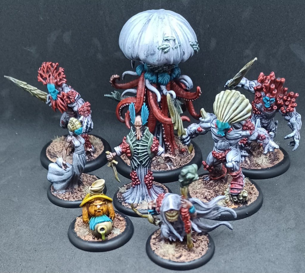 L->R: 2x Shorebound Sentinels, Silent Siren, the Colony, Urchin, Silken King, Shorebound Sentinel. Credit: Wyrd Games