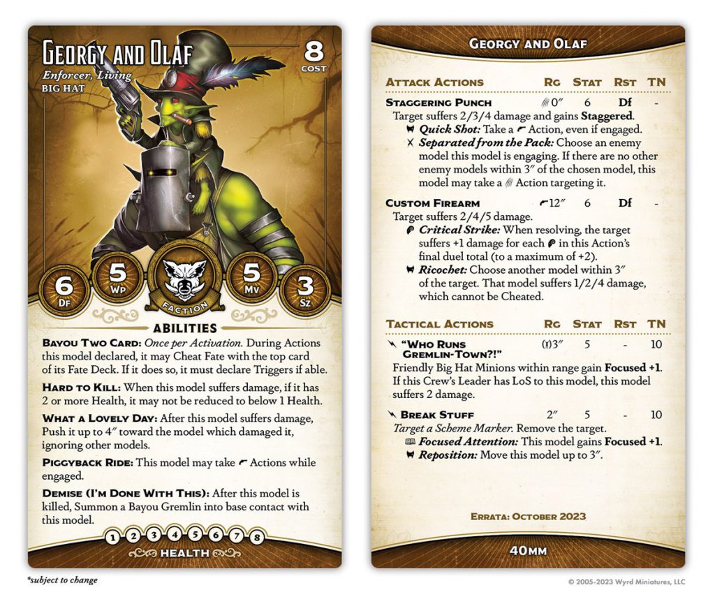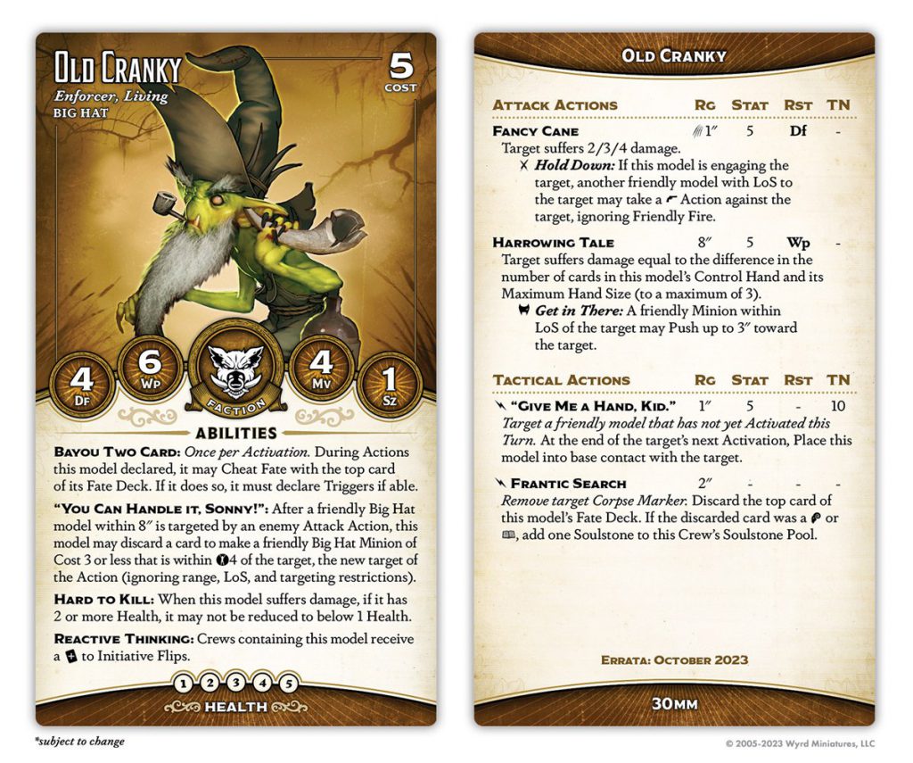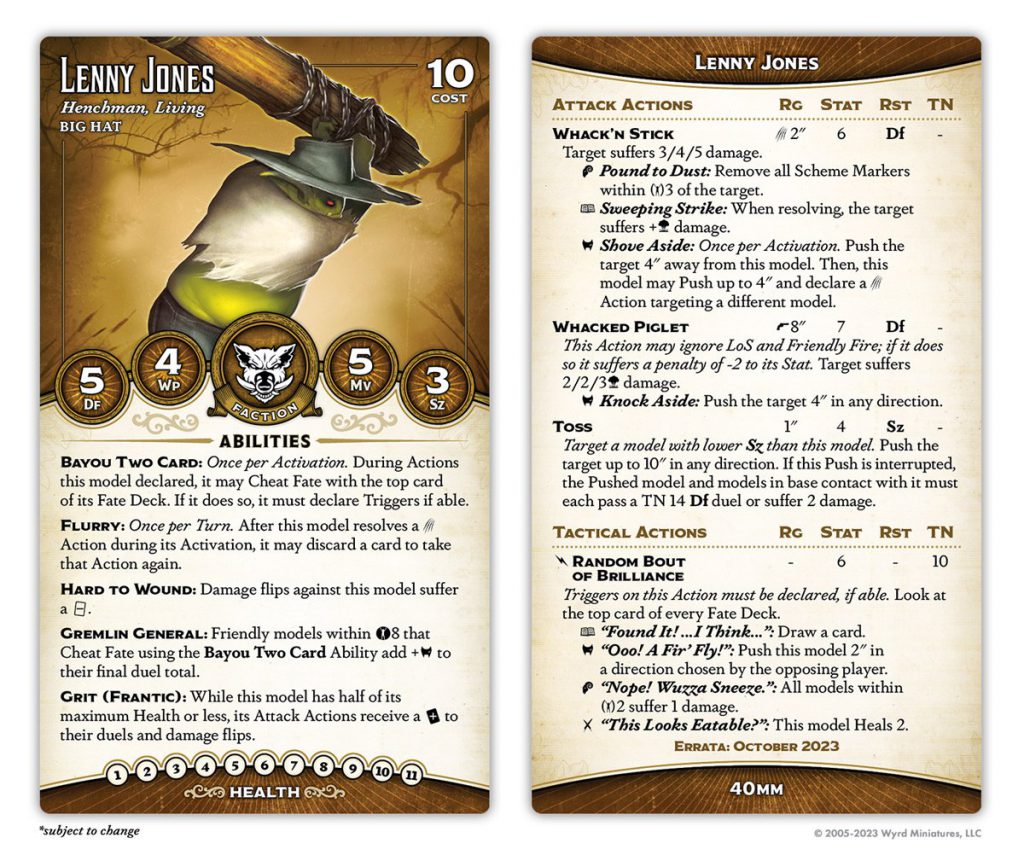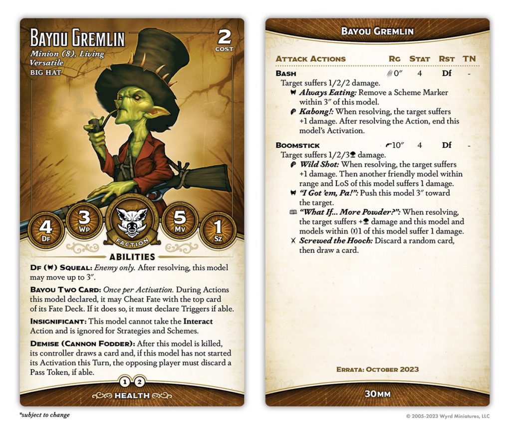 Good ol' Lenny's been a faction staple since First Edition, just like his pa. He's gone up in cost by one soulstone, but gained a point of health to compensate. He's lost Bodyguard and Ruthless but gained Flurry, giving him the potential to inflict absolutely crippling damage, especially paired with his Grit (Frantic). His Gremlin General ability has changed, too, no longer providing +1 to duels outside of a model's activation but now adding a mask to all Bayou Two Card cheats (which effectively lets you take a decent trigger in the event that your forced trigger would be unfortunate).