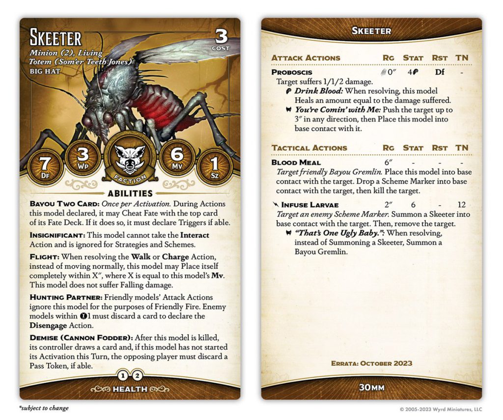 didn't get a stat bump to compensate them for the loss of Bayou Bash. They lost Annoying (which was, to be fair, a pretty crappy Tactical Action) but picked up two very nasty new ones, including a Bonus Action for the first time. Infuse Larvae lets them actually remove enemy Scheme Markers despite being Insignificant, and even get a Skeeter or Gremlin in the bargain. And Blood Meal lets you teleport to a nearby Bayou Gremlin (say, one you just summoned) and turn him into a Scheme Marker.
