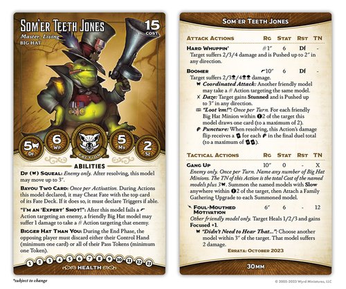 much nastier, gaining the Coordinated Attack and "Loot 'Em!" triggers. The former is obviously fine, it's a free attack, but the latter is really great: it lets you draw up to two cards based on the number of Big Hat models near the target. Since you'll often be able to shoot into melee without penalty (of which more in a minute), this is just two free cards as long as you have a decent Tome - it's a better Good for a Laugh, and that trigger is