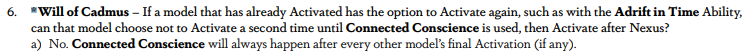 last thing that happens. It's a big part of the crew's power. Double-activating a model is not a common ability, but it's not as rare as it was. This will help Nexus against Asami, Tara, and Molly... and nobody else, right now, but maybe someday.