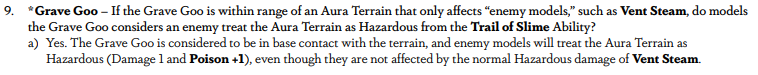 The Grave Goo is a persistent source of complex rules questions. This is not how I would have expected this one to come out. A lot of models make terrain auras that friendlies can ignore, but if you get the terrain all gooey, then they can't ignore that. Makes sense, I guess? Vent Steam around a Grave Goo... imagine the smell.
