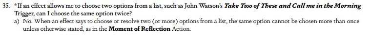 This was strongly implied from the wording of other abilities, but it's nice to have confirmation. Chose TWO options, not ONE OPTION TWICE, you little chiseler.