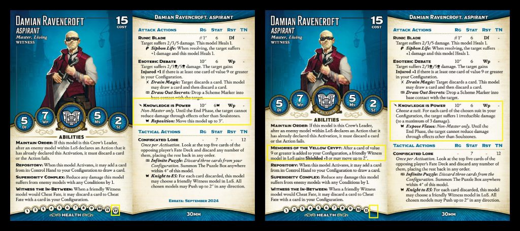 gone. No more free pushes and free Shielded. This is huge: good Damian players could trigger Memories over and over and over, sometimes more than once per activation, and get an insane amount of out-of-sequence movement on their whole crew. The ability not having a range was very stupid. (It's also stupid on Maintain Order, but I guess he gets to keep that one for now). That really put the crew over the top; without it, Damian is going to have to take a lot more Walk actions, which will impact his damage bottom line. Combined with the change to Knowledge is Power, he's doing the same thing he did before, but with a lot less damage output.