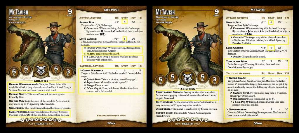 His new bonus action is quite good, too. It's a lot like the old Gator Snack, although it generates ranged attacks instead of melee attacks (sensible, now that he's a shooter first) and the effect comes from the activation flip rather than a random flip off the top of your deck - which means it can be cheated or Soulstoned for consistency. That makes it