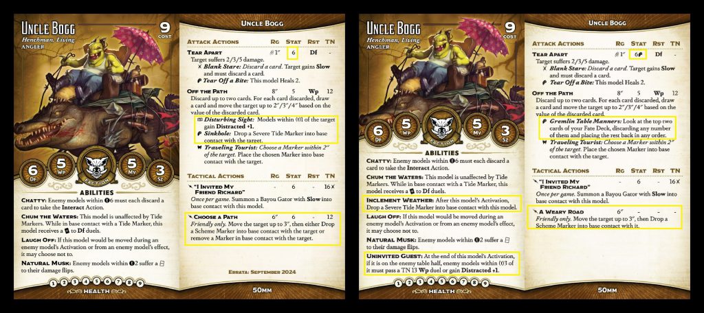 In this case, it's surprisingly minor. Bogg has lost Uninvited Guest, which only triggered sometimes, was remembered by the controlling player even less often, and actually impacted the board even less often than that. I do not mourn the extra bookkeeping. He's also lost Inclement Weather, which seems laser-targeted at OOK hiring; within Angler, it's trivial to keep him on a Tide Marker 100% of the time, but outside of his own keyword it'll take some doing to set him up on one. (Not impossible, though!).