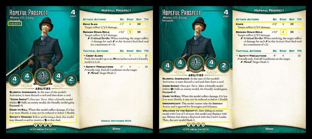 Starting with Hopeful Prospects, the little guys have lost their ability to grow up by killing enemies - sad, but that was far too swingy to ever be balanced, especially with the advent of Ancient Constructs. In return, they've gained... a lot, actually. They're Significant now, and have the new Society keyword as well as the keyword ability Society Honors, which lets them discard a card to gain a +flip on any duel. They've added Creep Along as a bonus action to give them some mobility, their melee attack has gained a 1" range (and apparently now represents a brisk rifle-clubbing rather than a sly stabbing) and their guns have gained +1 stat. They're still dirt cheap, but I think I'd actually consider them now. Condition removal is great, they filter your hand, hand out Focus, they have three AP all the time, and at Stat 5 their gun is actually kind of fearsome - nobody wants to get donked for a Severe 6 from 14" away, especially not at the hands of a 4 stone minion. You know, I'm talking myself into it...