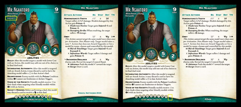 Mr. Ngaatoro is the same as he ever was, only moreso. He's gained a pip of health, the Society keyword, and Society Honors, and... that's it.