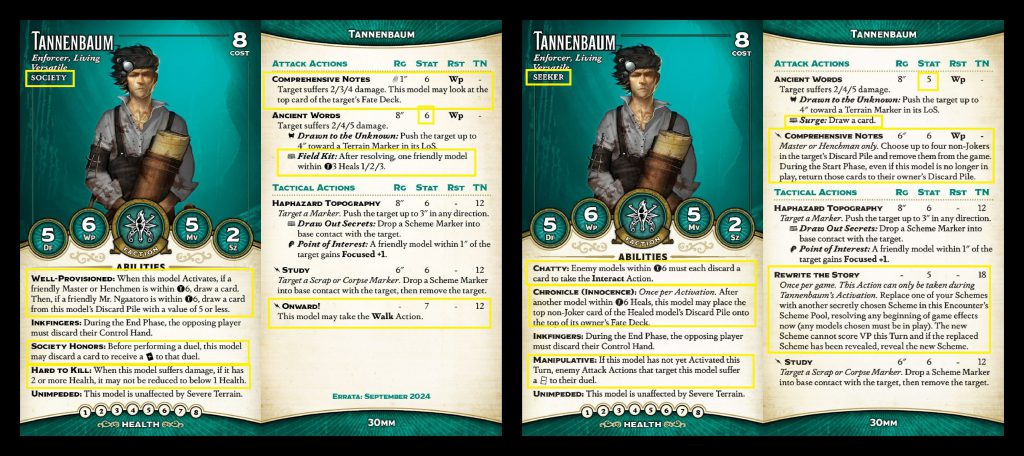 He's traded Manipulative for Hard to Kill, a straight upgrade, but lost Chatty and Chronicle. The latter of those is sort of whatever (and inevitable because he's not a Seeker anymore!) but the first stings; Chatty is really strong, and the Society doesn't have any other source of it.