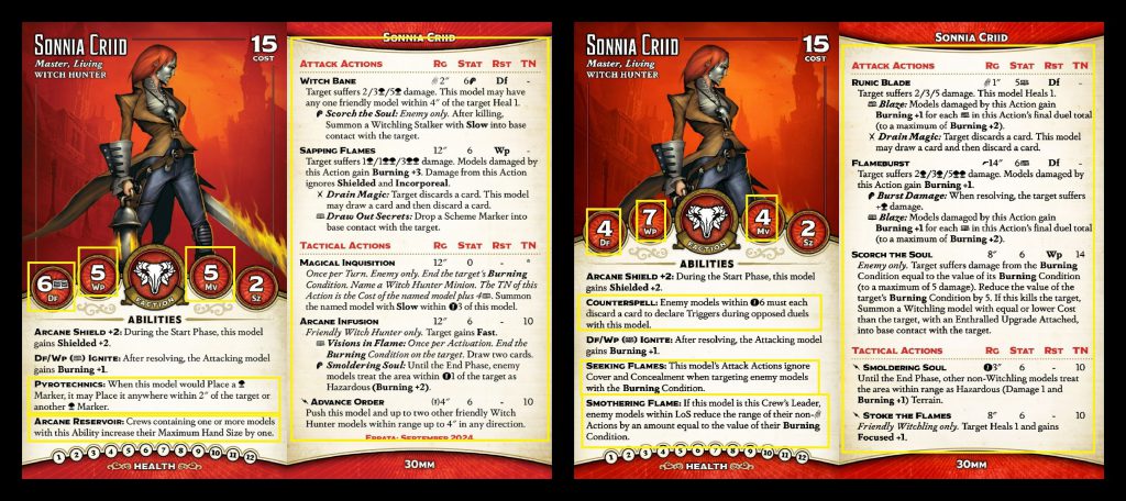 This Sonnia might as well be a brand new model. She went from "awful Df, great Wp, super slow" to "good Df, bad Wp, normal speed." Ignite is now built in on her Df. She lost Counterspell, Seeking Flames, and Smothering Flame, but gained Pyrotechnics (Wong2's ability to chain Blast Markers) and Arcane Reservoir.