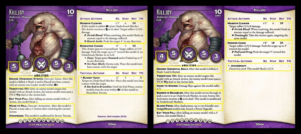 His back of card features two tweaks and one significant change. His melee attack lost a point of damage on Moderate swings but gained a built-in +twist if he's near Underbrush, a straight improvement over the old Barbed with Brambles. He's lost Onslaught, somewhat limiting his offensive output, but Drink Blood will keep him alive (and makes losing Juggernaut sting less), and quite frankly he doesn't