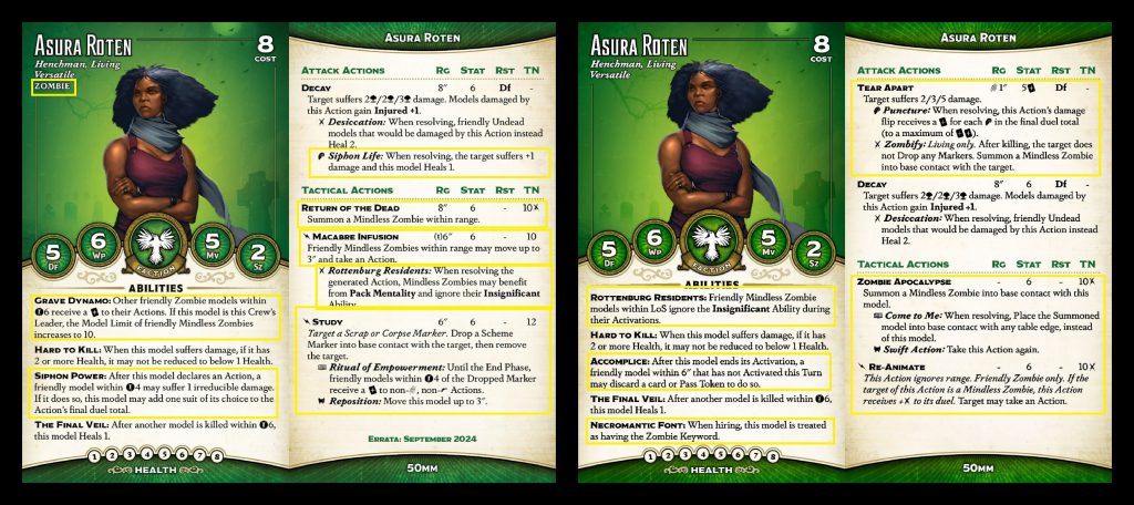 Her card has basically been rewritten. She doesn't make all your Mindless Zombies perma-Significant, but she does give them a passive +twist to all actions, which is... probably not as good, but the old ability would be busted in a crew with TEN ZOMBIES. And Siphon Power just means she gets all her triggers for free whenever she wants, because you'll never be short of dead flesh to siphon.