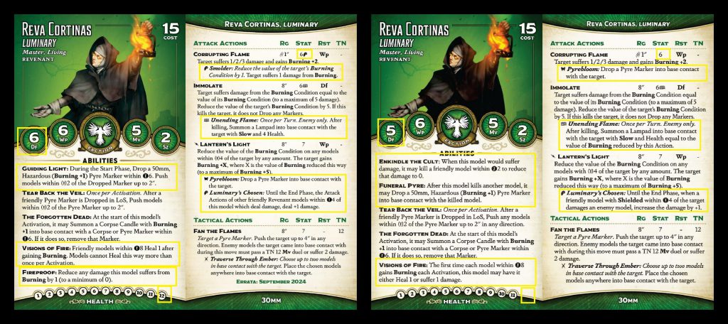 Funeral Pyre has gotten a side-probably-upgrade - now Reva gets a free Pyre Marker in the Start phase, rather than when she kills something. (Mostly you got those markers from Enkindle kills, but Enkindle is gone now anyways). Note that the free push from Guiding Light is