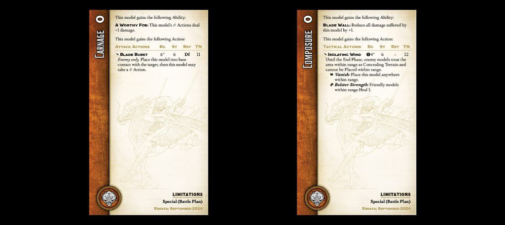 Their actions have been, basically, completely reworked, including by giving them a bonus action for the first time - a requirement for any model to see play. They have two, actually: Onward is the gold-standard bonus action, a third AP, and Wow the Audience is a cheeky little attack that will occasionally get a card out of your opponent. Their melee attack has changed to attacking Wp (thematic) and is a bit more consistent at the price of losing some top end (but, get real, you weren't really whacking people for 5 with your hairpin). And Lure has traded out for Beckoning Call, which is a straight-up upgrade even though the stat is a bit lower. The triggers on Beckoning Call are impressive here, although I think at stat 5 you will most often be targeting friendlies to push them around, so the crow trigger isn't quite as good as it looks.