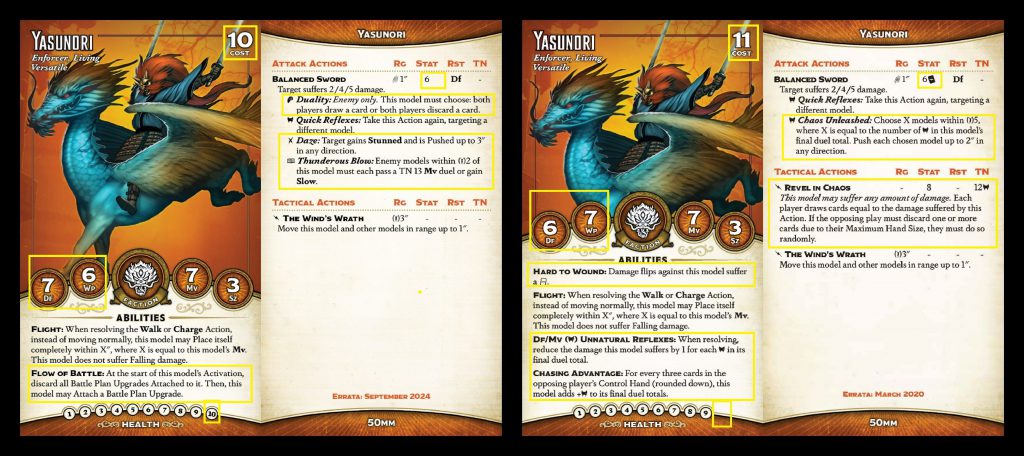 Another terror of 2E paying for his sins, the "Ten Thunders Rider" has never matched up to his siblings. Yasunewri (see what I did there?) abandons any pretense at Riderhood; now he's just a beatstick. He's gone down in cost and up in Health, and his Df and Wp have switched places, though he's lost Hard to Wound and his defensive trigger. His weird hand size mechanic is gone, replaced by a pair of upgrades.
