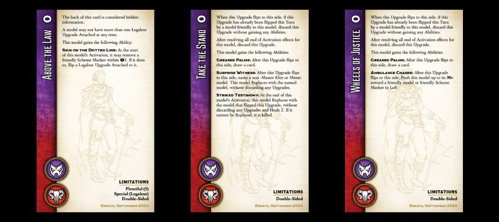 There are five of these, each double-sided. How does that work? Well, the "front" side of all five upgrades is the same: Above the Law does nothing by itself, but allows the model wearing it to flip the upgrade by discarding a