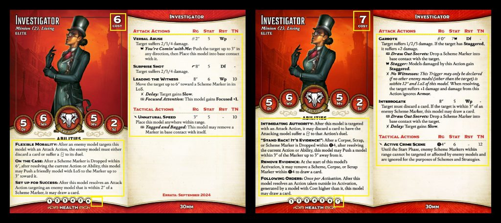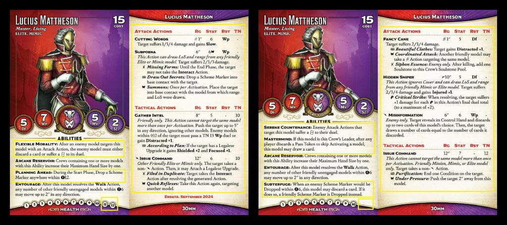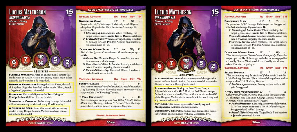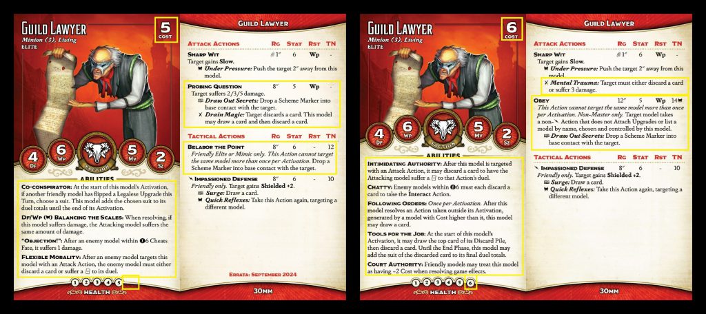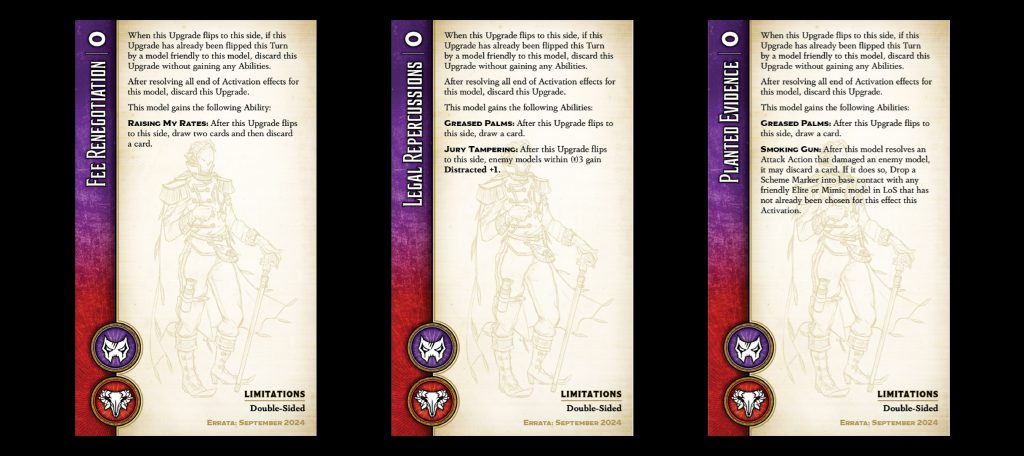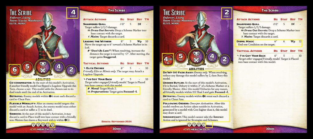 bit easier to kill in one shot, though an extra pip of health, Flexible Morality and +2 Df do make that a bit more challenging. The Scribe still has Betrayal, but he no longer has Following Orders - in fact, almost none of the Elite/Mimic models do, the card draw from Legalese upgrades having basically replaced that. In its place, the Scribe has gained Co-conspirator, the first of several similar abilities we'll see. These abilities trigger once a friendly model flips a Legalese upgrade and provide some bonus. In this case, it's the suit of your choice to all duels for one activation.