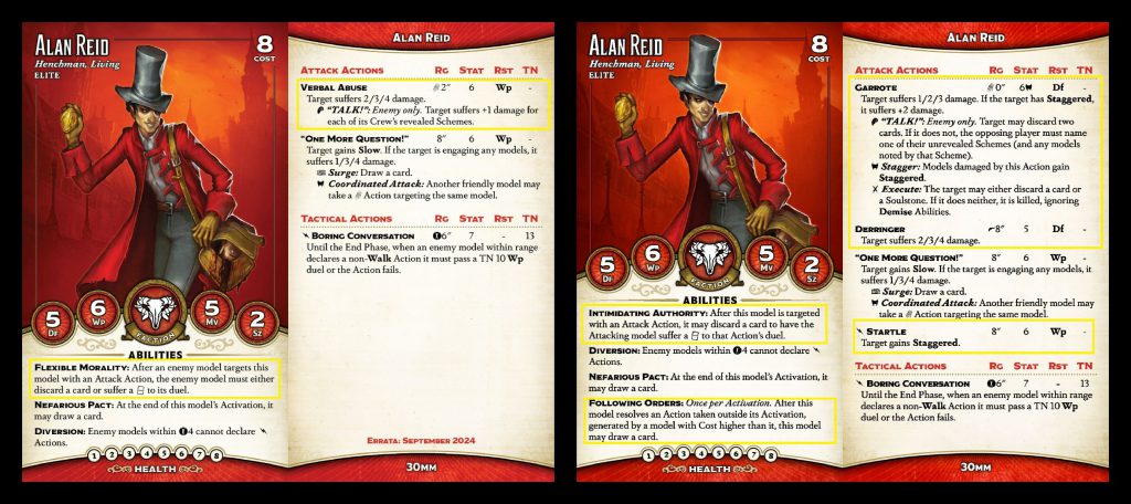 His garrote has become Verbal Abuse, with a 2" engage and targeting Wp instead of Df. He's lost Execute and Stagger, as well as his weird trigger that made enemies reveal their Schemes. RIP. In return, the attack does more base damage, and he still has a conditional +2 damage based on your opponent revealing Schemes.