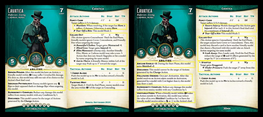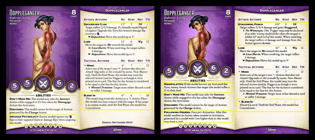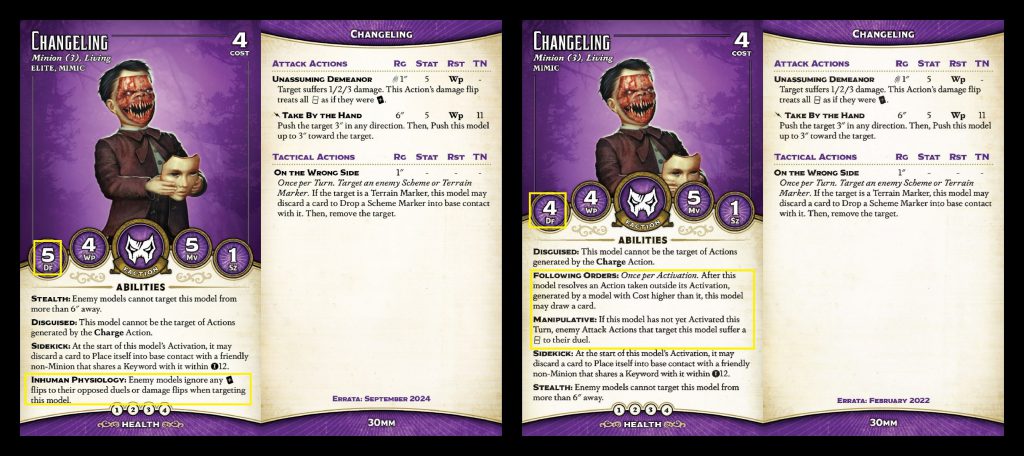 Finally, we have Malifaux's second or third or maybe fourth creepiest Creepy Kid. We have the Dreamer, Malifaux Child, Stolen, Kade... anyways, these guys just got errata'd a couple of years ago, so the changes are basically just to their front of card to bring them in line with the rest of the crew. Instead of Flexible Morality, they've got Inhuman Physiology, which is actually super annoying. The combination of Stealth and Disguised has meant that it's very hard to get two attacks into a Changeling in one activation, so the typical way to remove them is via a single Focused swing. That's not an option anymore, so they'll much more often live to teleport away with Sidekick. I am already frustrated just thinking about it. Bumping their Df to 5 is insult to injury - these things are just too annoying to remove for their cost.