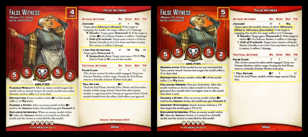 no cheating, it's now an aura that lets your models cheat last, which is distinctly less powerful (though much easier to set up, especially given the fragility of the Witnesses). They've gained a new bonus action, Cry for Attention, which doesn't do much but will occasionally Distract or even Lure a target.