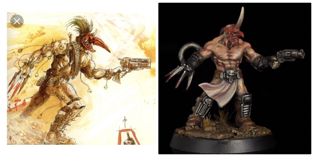 what I want to share here are two models that were a personal turning point for me into more serious kitbashing and directly inspired by a couple of John Blanche illustrations. These kitbashes were for a contest with the idea of taking two infantry kits and combining them to make a blanchitsu style warband. I used Kairic Acolytes and Orlock gangers (plus citadel skulls, greenstuff, and piano wire) to make these wasteland scavengers/chaos weirdos.