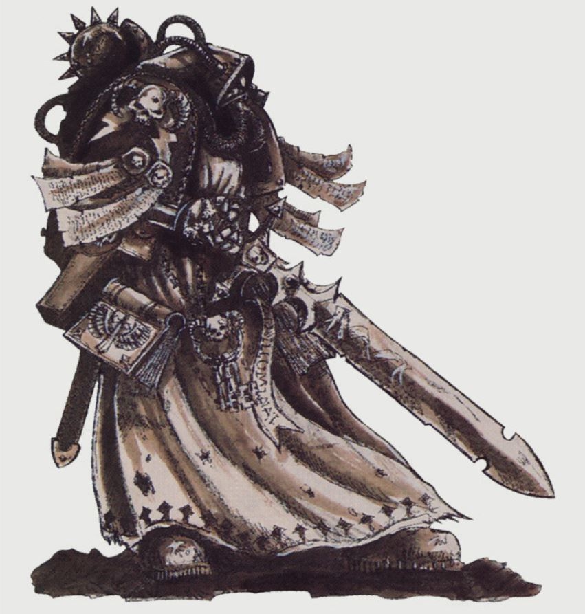 John Blanche's picture of Ezekiel, Chief Librarian of the Dark Angels, is peak 40k for me. Powered Armour? Check. Hood and Robes for Maximum Mystery? Check. Honking great magical weapon? Check. Obscene amount of PPE and a Bionic Eye, hiding what little vestiges of humanity remain?