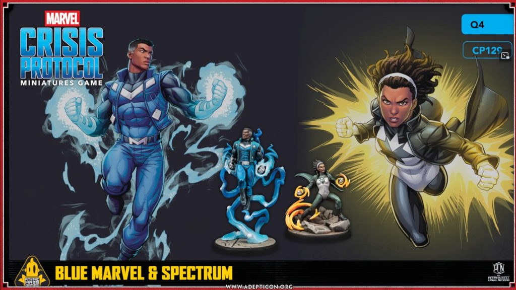 It’s virtually guaranteed that AMG will reveal some character cards at Ministravaganza, but which ones seem most likely? A review of the content roadmap from Adepticon, presented in March, appears to offer the best insight. Spectrum and Blue Marvel were initially slated for release in Q4 2025, but with the year approaching close (and AMG largely going quiet for December), they’ll likely be released early in 2026. That being the case, it would make sense for AMG to show off the character card for either one and save the other for January.