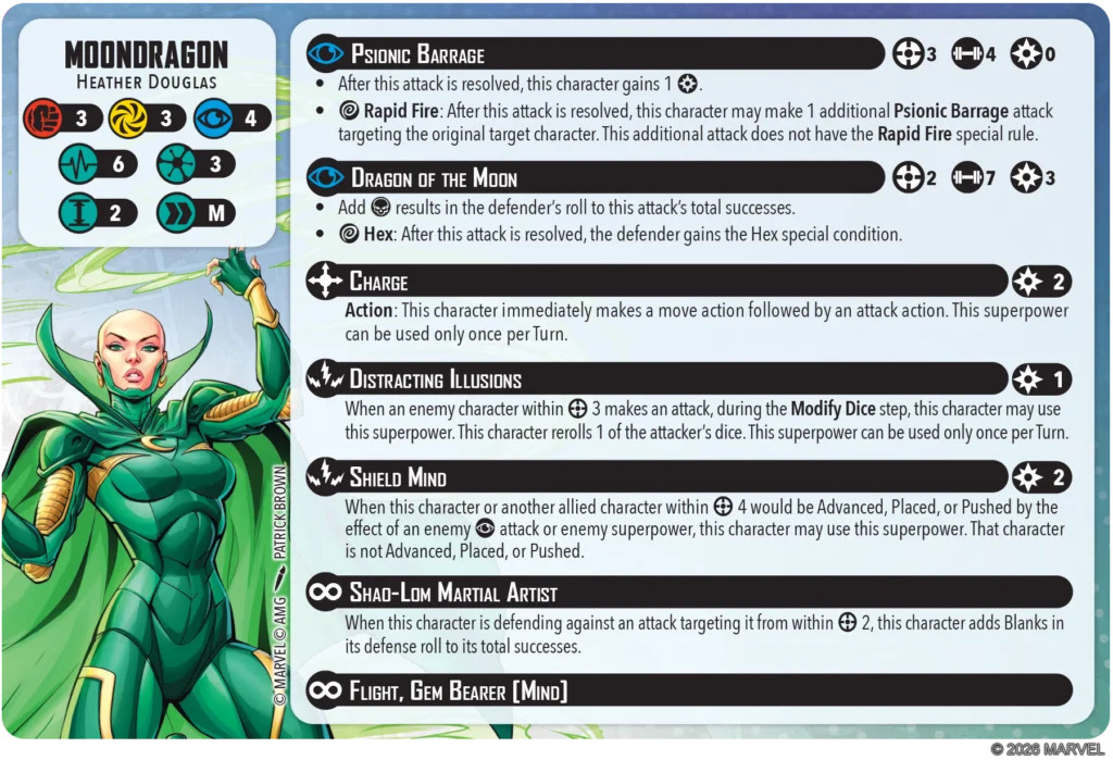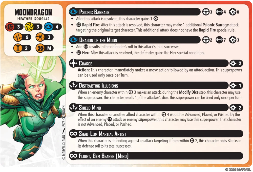 Moondragon’s spender, Dragon of the Moon, lets her dark side out for a pretty decent attack- 3 power for 7 mystic dice that count the opponent’s skulls and have a wild Hex trigger isn’t bad, and it enables her to punch harder on a clap-back turn. In practice, though, I’m not sure how many of these you’re going to get off in a game- it’s only range 2, and Moondragon has so many great things to spend her power on that it’s hard to imagine much getting budgeted for this.