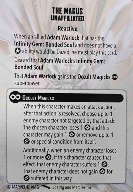 So to play this card, you have to be playing Adam, he has to have the Bonded Soul Gem, and you can’t be using his leadership (no, as near as I can tell, you cannot use Versatile Strategy to start with Adam’s leadership, then swap to Star-Lord’s play this card- Cosmic Awareness gives Adam a leadership, regardless if it is active or not, so if you’ve played Cosmic Awareness, he’s too…aware…to become the Magus). Then, if he would be Dazed, he must play The Magus. He loses the Bonded Soul Gem and gains the Occult Magicks superpower instead. Occult Magicks, essentially, makes any enemy model attacked by Adam lose a power and Adam simultaneously either gains a power, heals a damage, or removes a condition (these are an AND trigger, not a then, so you if the enemy doesn’t have power to lose, you still get the second half of the effect). Additionally, any time an enemy loses 1 or more power from an effect caused by Adam (either from The Magus or from his Karmic Blast attack’s wild Sap Power trigger), they take a damage which does not gain them a power. Note that a character who loses power from Karmic Blast’s trigger will lose that power and take a damage at the “before damage” step from the trigger and then will lose another power from Occult Magicks after the attack is resolved, potentially taking another damage if they have power to lose.