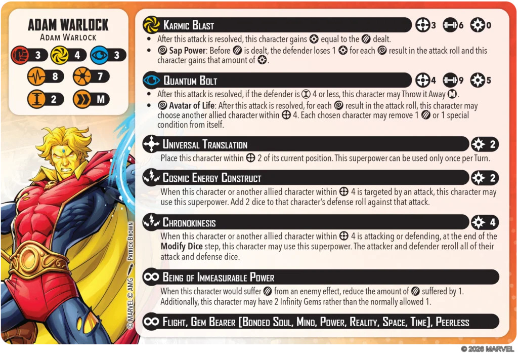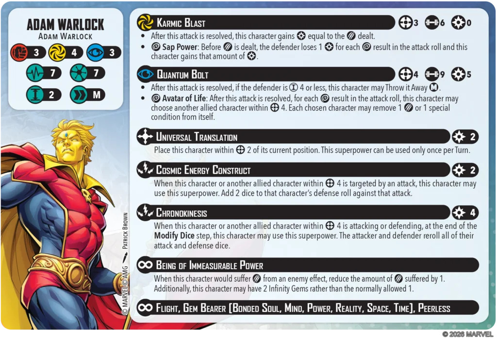 Adam Warlock comes in at an eye-watering 7 threat, tied for the second most expensive character in the game to date. His stats are…not what you’d expect at that value, to be honest. He’s of very average speed (medium move on a small base) and middling defensive stats (3/4/3 with 7 health on the front and 8 on the back). Hardly a standout, but there’s more going on here under the hood.