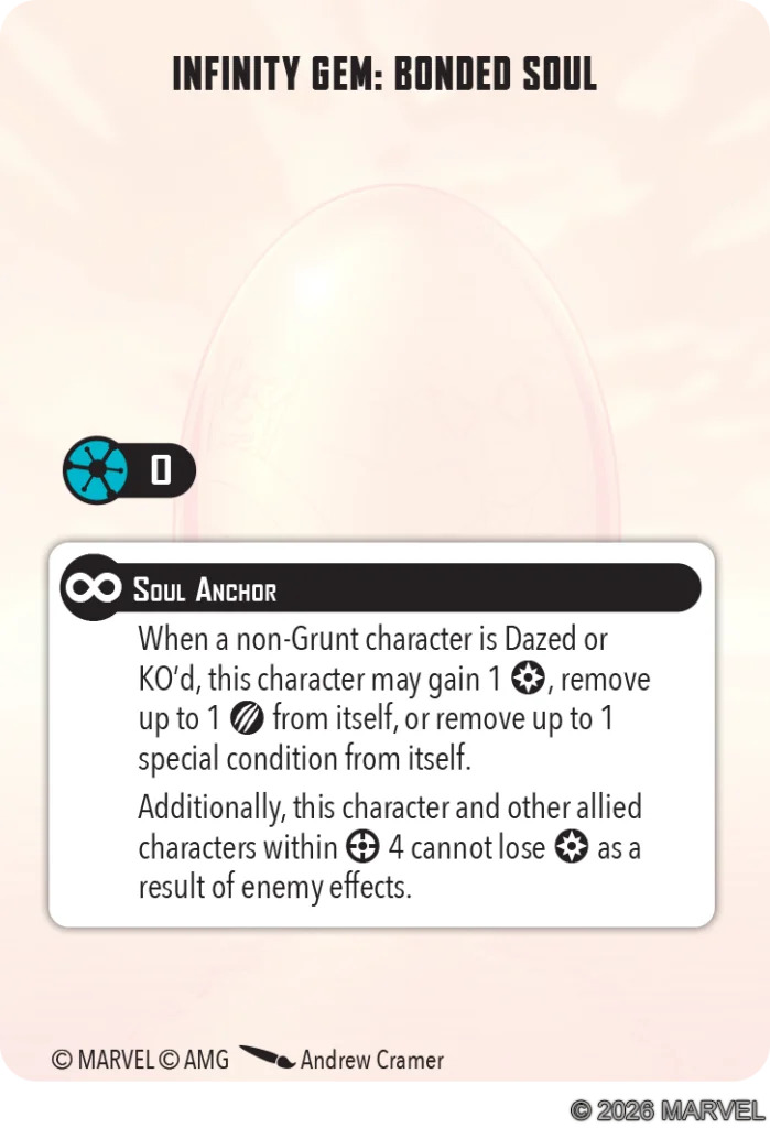The Bonded Soul Gem also has one other big thing going for it: it’s free. Now honestly, I’d much rather AMG have made it cost 1 threat and made Adam a 6 rather than a 7; I think taking a second Gem is something you’ll often consider with him, but I don’t think there’s much the (repeatedly nerfed) Gems can do to make it worth spending nine threat to get two of them other than this one. I think Adam will be just fine as a model who takes the BSG and one other Gem 95% of the time (I'd guess Reality, Space, and Mind if Moondragon isn't using it will be the top picks), but it would be nice from a space to explore perspective to give players the option of running him Gem-less as a 6 or with various combinations at 7 or 8 threat. Ah well.