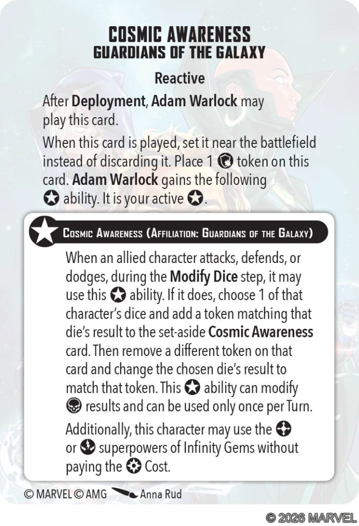Essentially, Cosmic Awareness lets you bank dice faces. Once per turn, when one of your characters attacks or defends, you can swap a dice face in your roll for one matching the token on the card (it starts with a shield) and put a token of the original face on the card for later. So while defending, for example, you could swap a hit in the roll for the shield that starts on the card, putting a hit in reserve for a later turn and changing that die face to a shield to block an incoming damage. It’s important to clarify that this is per TURN, not per round, so you can use it once on each of your turns and each of your opponent’s. To sweeten the pot even further, you can modify skull (failure) results with this, too- though it means putting a skull into reserve for the next time you use it, and not many Guardians have a way to count skulls in their rolls (Cosmic Ghost Rider while psychotic is the only one that immediately comes to mind).