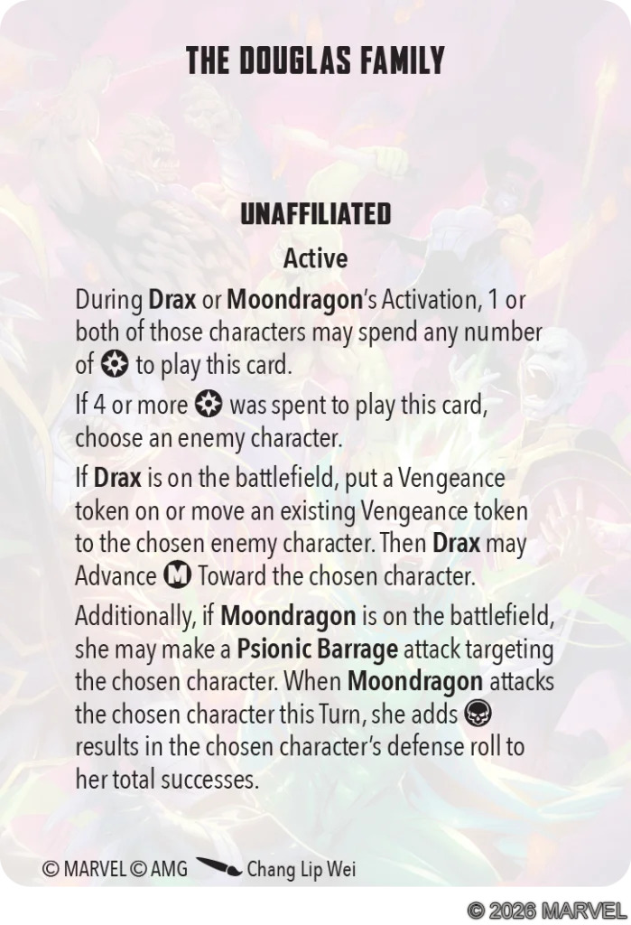 Moondragon also has two Team Tactics Cards linked to her. Power Couple requires Moondragon and Quasar, so we’ll talk about that in a moment. Let’s get into The Douglas Family first.