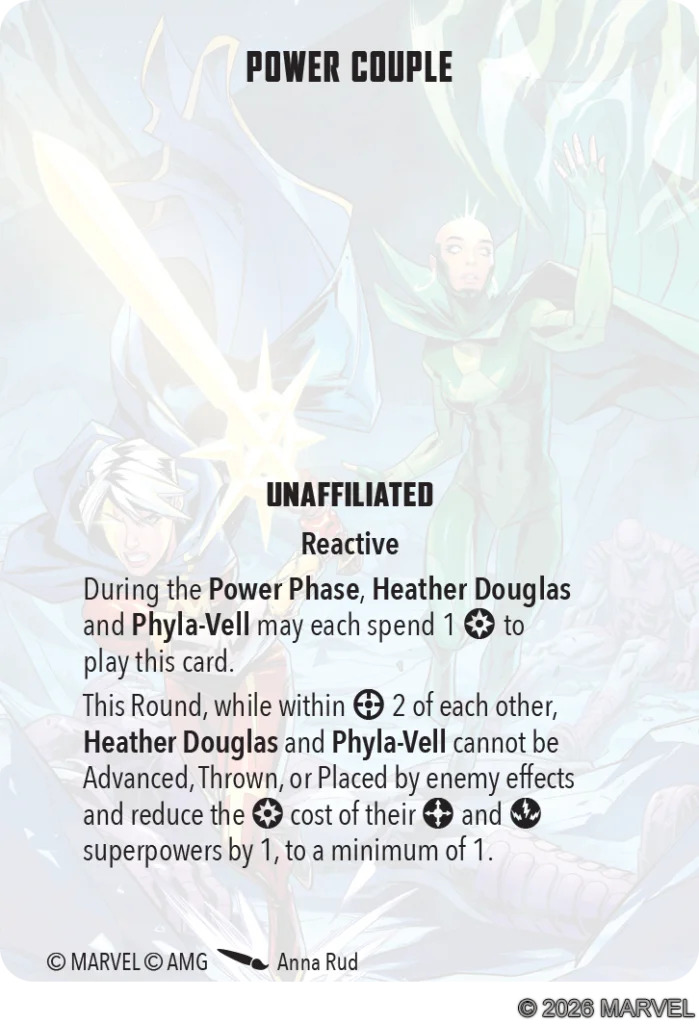 Unlike The Douglas Family, this one (appropriately) DOES require both Moondragon and Quasar. It’s also quite a bit better, in my opinion. This is just a good, solid effect- stopping displacement and discounting quite a few superpowers- two on Moondragon and three on Phyla. You will need to be careful, as it’ll be really easy to Charge out of the Range 2 requirement for the card’s effects, but if you can set up a little ladder move where the first model charges up and then the second comes up to join them on the subsequent activation, there’s solid value to be had here. I’m always a little leery of cards you’ll only be able to play when you’ve got two specific models on the table, but Guardians of the Galaxy historically haven’t had a ton of strain on their TTC slots, so this might see some play there, especially thematically or if the Guardians player is trying to lean on bunched up secures like Wedding Party or Mayor Fisk.