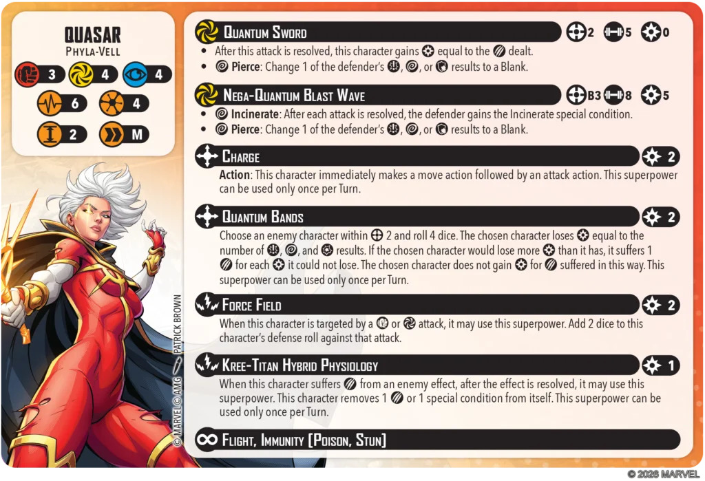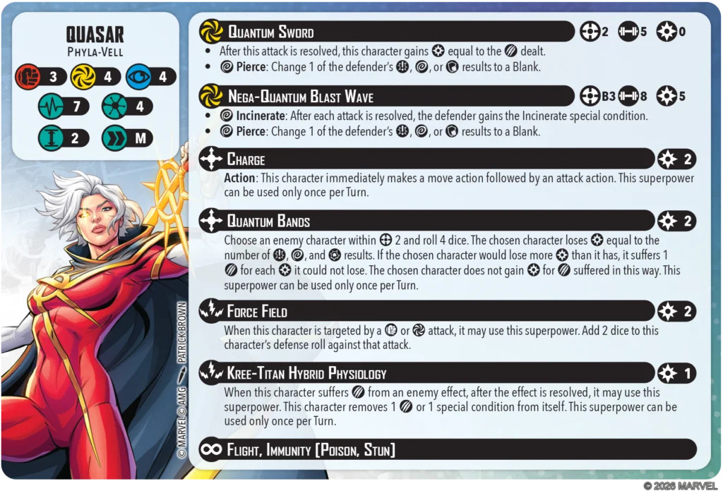 Kree-Titan Hybrid Physiology is a heck of a name, and a heck of an effect! For the low price of 1 power after an enemy effect (not just attack) that damaged her is resolved, Quasar can heal herself 1 damage or remove 1 special condition. That means any effect that damages her is guaranteed not to put a single condition on her (if you get Full Auto-ed by the other team’s Star-Lord, so sorry, you can only stop one!). But if Namor damages her for a Stagger? Gone. Someone deals damage to give her Bleed or Slow? Nope. Absolutely great. This is going to make her stick around (and at close to full efficiency) way longer than it looks. Just note: this power is once per turn, not every time she takes damage (unlike Apocalypse, who has a similar ability but gets it on each instance of damage). Quasar is reasonably durable, but she will go down to a dedicated attacker, especially one that hits her multiple times in a turn.