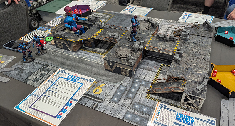 Basement of Death is a gaming group that has become known for their massive 3D Space Hulk Board and now they are bringing that same passion to Marvel: Crisis Protocol. This year they brought two scenarios, one based on the official Thanos Infinity Gauntlet Ultimate Encounter and this one, a custom encounter designed to bring a Sentinel themed Ultimate Encounter to the game. Both feature custom 3D terrain features to add a little extra pizzazz to the scenario.