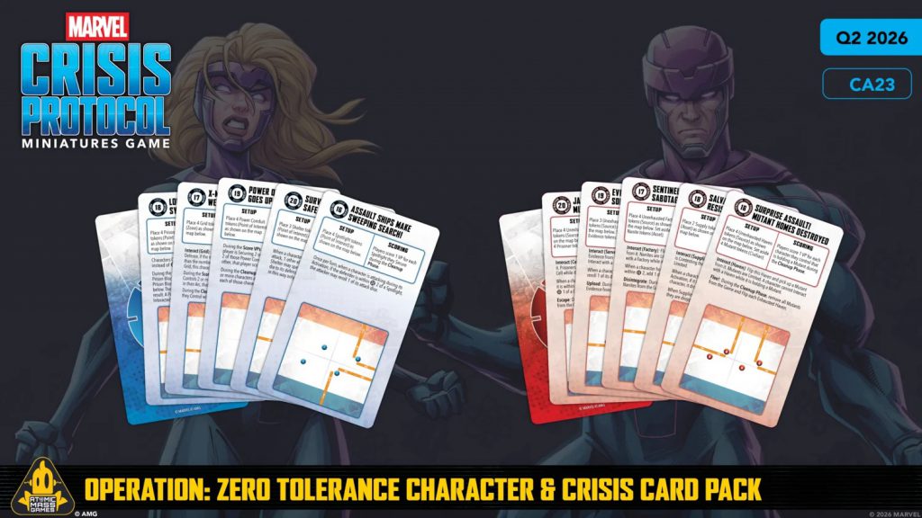 While AMG didn’t show off much of the upcoming Crisis pack, they did reveal one new Secure and one new Extract. Surprise Assault! Mutant Homes Destroyed is the second Source Extract to enter the game (behind November 2025’s Lockdown), and Assault Ship Makes Sweeping Search! looks set to be a future attrition favorite with its tight shape and bonuses for attack rolls.