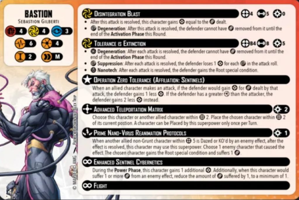 Prime Nano-Virus Reanimation Protocols is his second superpower. When an allied character is dazed or KO'd Bastion can pay 1 power to do a damage to the character that did it and give them the root condition.