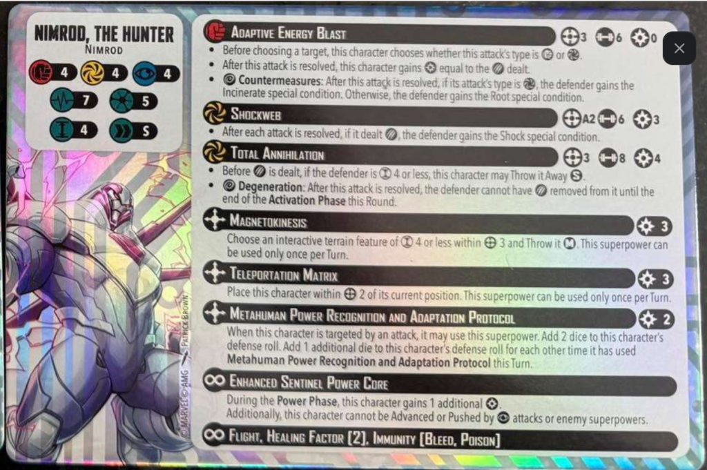 Finally, Nimrod has immunity to bleed and poison as well as flight and healing factor 2. Healing factor becomes more useful the more health a character has, and at 7 health it can go a long way to keeping Nimrod healthy. Immunity to bleed and poison will always be useful especially against specific factions like the