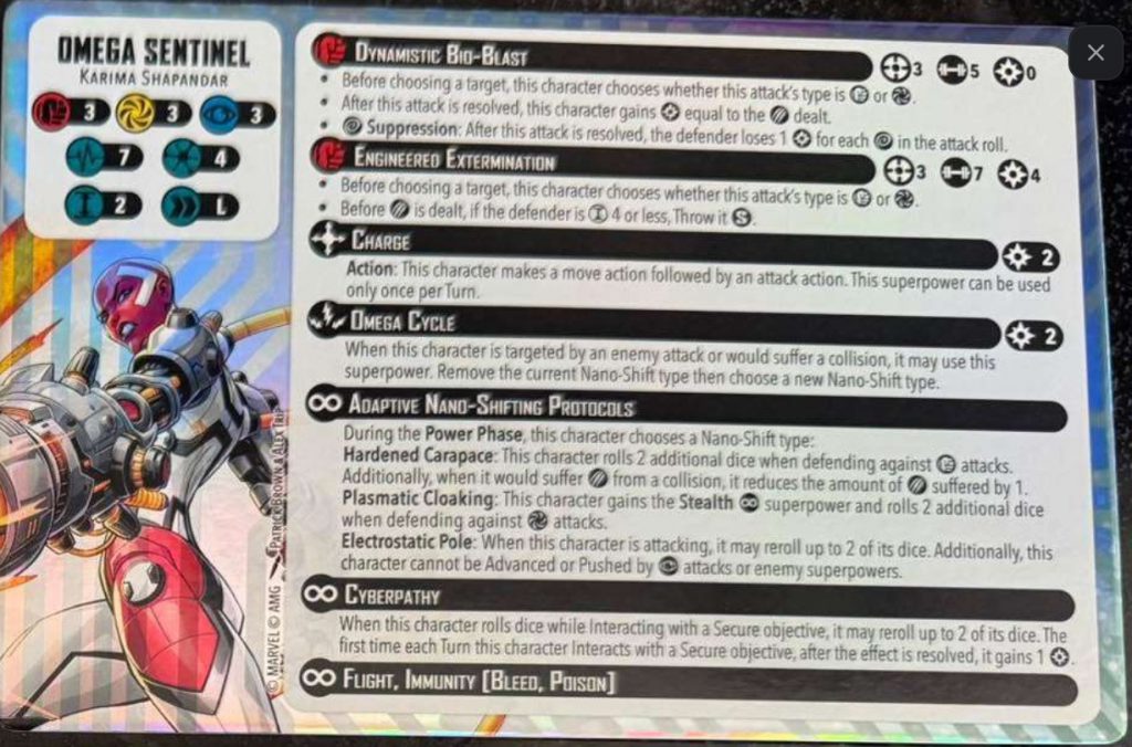 Omega Sentinel is a 4 threat character with 3/3/3 defences and a long move. She has 7 health which appears to be the new standard moving forward for 4 threat characters. This stat line alone will make her very fast, and the relatively low defences will be mitigated with the rest of her card below.