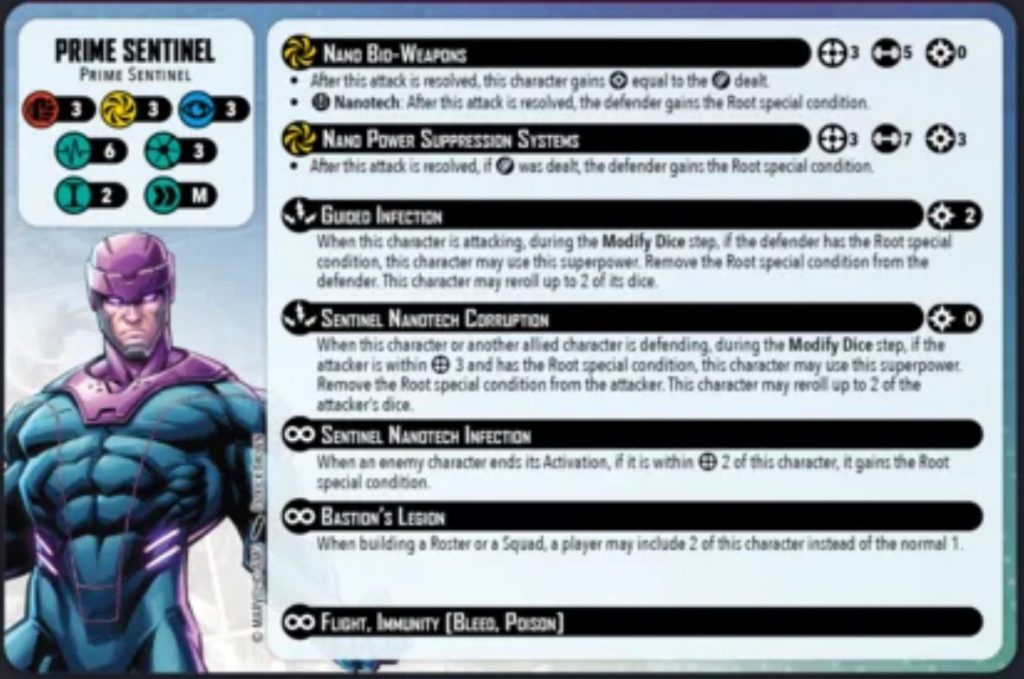 Sentinel Nanotech Infection is the Prime Sentinel's first passive superpower. When an opponent ends their activation within range 2 they gain the root status condition. This is similar to abilities we have seen on Iceman and Omega red who can both passively give out special conditions of their own. With several abilities requiring the enemy to have root this is a powerful ability. Any opponent who has to walk onto the same secure as a Prime Sentinel will then have to deal with having the root condition. From there the Prime can reroll their own attack dice when attacked or reroll its own attack dice into them.