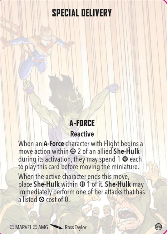 Special Delivery is the new, non-banned version of Drop Off. It requires an in-affiliation flyer (Angela, Captain Marvel, Crystal, Scarlet Witch, Storm, or Wasp) and She-Hulk to both pay 1 Power and you place She-Hulk within Range 1 of the end of the character’s move. Plus She-Hulk then gets to make an attack with her builder. Great stuff! Even the restriction on who can use it isn’t terrible since there are plenty of fliers. Grade: A-