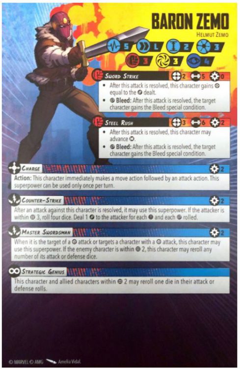 Baron Zemo was the darling of the starter set, and still stands up today. He zips around the board with his Long move, dishes out Bleed for fun, and does so much for his team. When I'm an old man, sitting on my porch and looking back on my life, I believe that "Zemo reroll" will be the phrase that echoes through my memories. Look out too for the Zemo Driveby: Charge in and attack, then Steel Rush and fade away again. Now you see me, now you don't. Grade: A