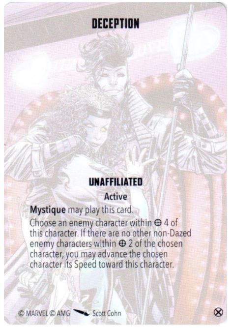 Staying with Brotherhood, the ever-popular Mystique can bring Deception with her. A free, guaranteed Advance with an enemy character? Don't mind if I do! Grade: A-