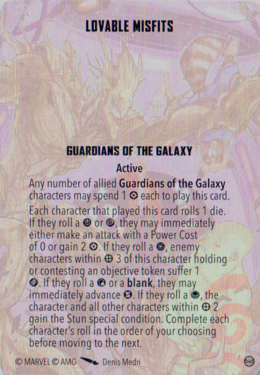 For character-restricted cards within the Guardians we get to play up the Rocket/Groot combo with Deadly Duo. There are a lot of setup conditions to fulfill but since this card does not use one of your actions you can end up getting five attacks out of Rocket in one activation. Five dice isn’t the best, and at least three of the attacks have to be against different targets, but this can help put out some pain or maybe finish off an already hurting character. Having re-rolls from Winging It is pretty sweet with this as well. Grade: B