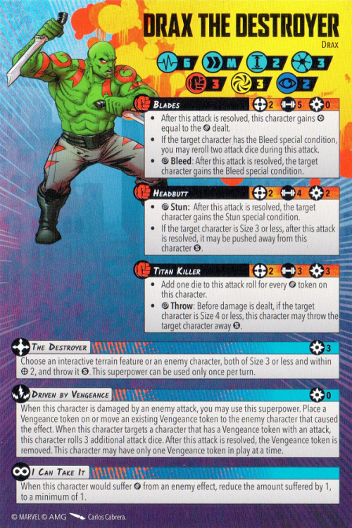 Star-Lord has a pair of decent attacks, average defenses, and maybe a little more than average stamina. His only superpower relies on him having terrible luck to swing things around for the better – if he rolls no hits when attacking or blocks when defending he can reroll the whole pool. That’s going to be good for people with