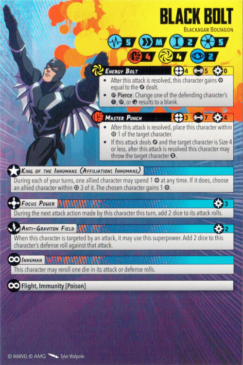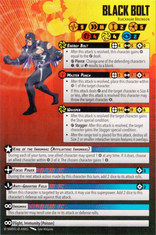 Anti-Gravitation Field), so Defenders will rip him open; other teams might choose to manage him with conditions. All in all this is a powerful package, although Black Bolt is inherently limiting as a 5 Threat leader, and not without his drawbacks. Still, it should be great fun figuring out how to use him optimally, and the model is out of this world.