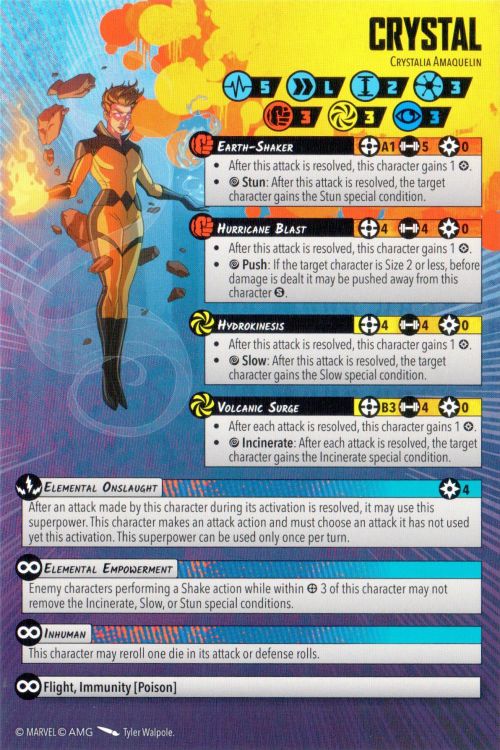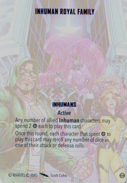 This could appear to be poor value, in that your Inhumans natively have one reroll anyway, so there is a reduced benefit. Nonetheless, it's worth consideration. In the case of Black Bolt and Medusa, they're potentially chucking enough dice that there is still huge upside; and Crystal can get so much joy out of her conditions that rerolling 4 dice instead of 1 to nail that Wild could make all the difference in the world.