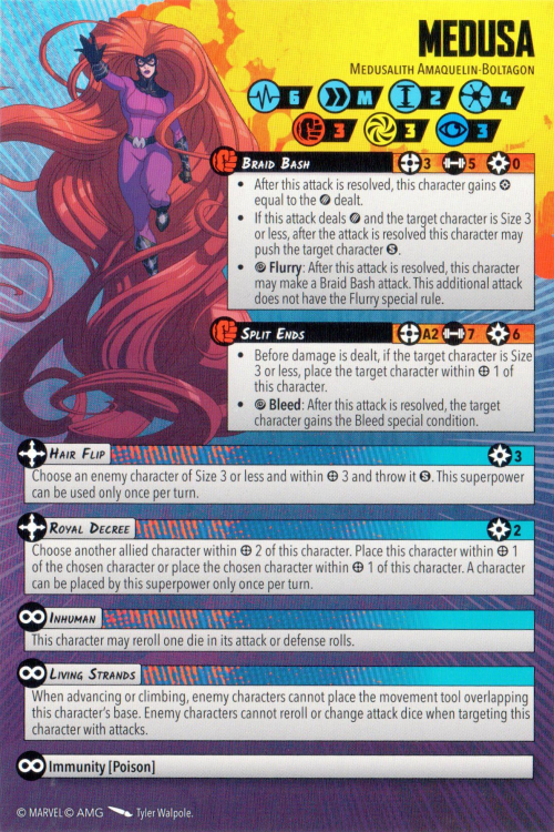 Braid Bash (her 5-dice builder attack) has Flurry – meaning that if you roll a Wild and a crit, you get to do it all again. We’ve seen this before, but what puts Medusa over the top is that as an Inhuman, she has an innate reroll to fish for that Wild; and if she does damage, Medusa gets to push the target character Short.